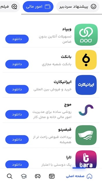 امور مالی : برنامه های مالی و کاربردی مثل بلو بانک ، ویپاد ،تارا ،موج …